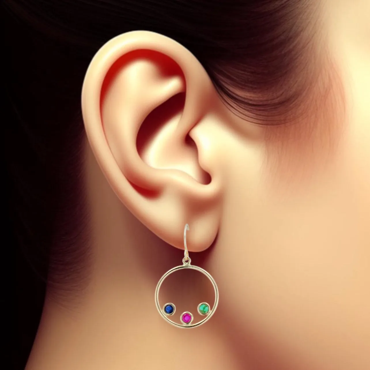 - These 14k yellow gold hoop earrings feature a unique three-color design with ruby, sapphire and emerald gems. The hoop shape creates a timeless look that is perfect for any occasion.