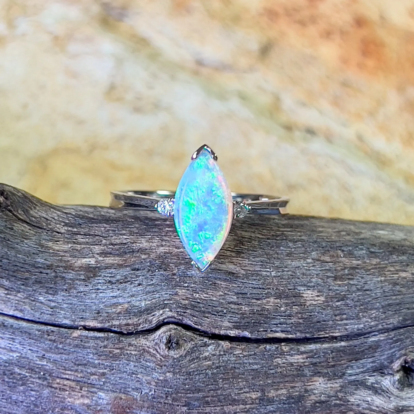 Experience the captivating beauty of our 18kt White Gold Marquise Crystal Opal and diamond ring! Featuring a stunning marquise teal blue opal, this ring exudes elegance and charm. Adorned with sparkling diamonds, it's the perfect accessory for any occasion. Elevate your style with this unique and luxurious piece.