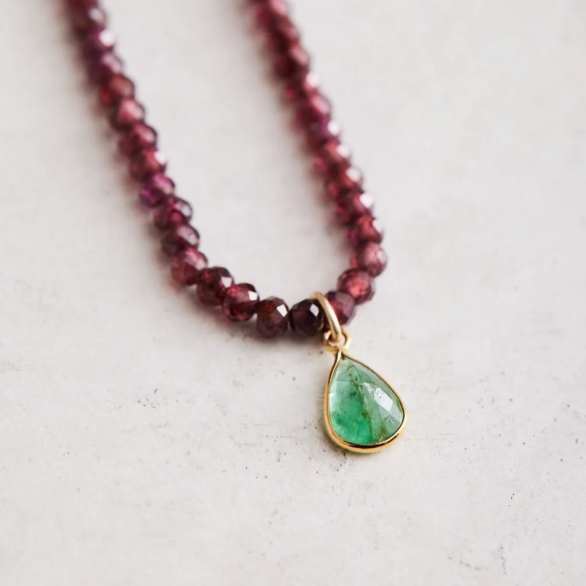16" Faceted garnet necklace with a large natural teardrop emerald set in 14k yellow gold and finished with a 14k gold magnetic clasp. Handmade by Nicole Gerulat.