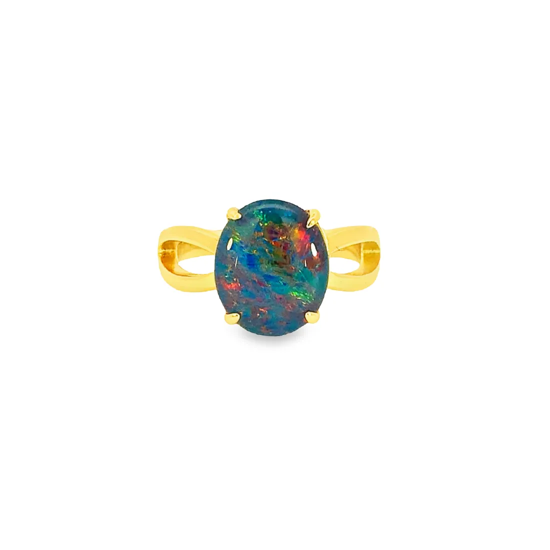 Make a statement and show off your bold style with this striking gold-plated opal triplet split shank ring. Featuring a 12x10mm opal encircled by shimmering gold, it's a perfect gift for a loved one or a special treat for yourself. Step out in style!