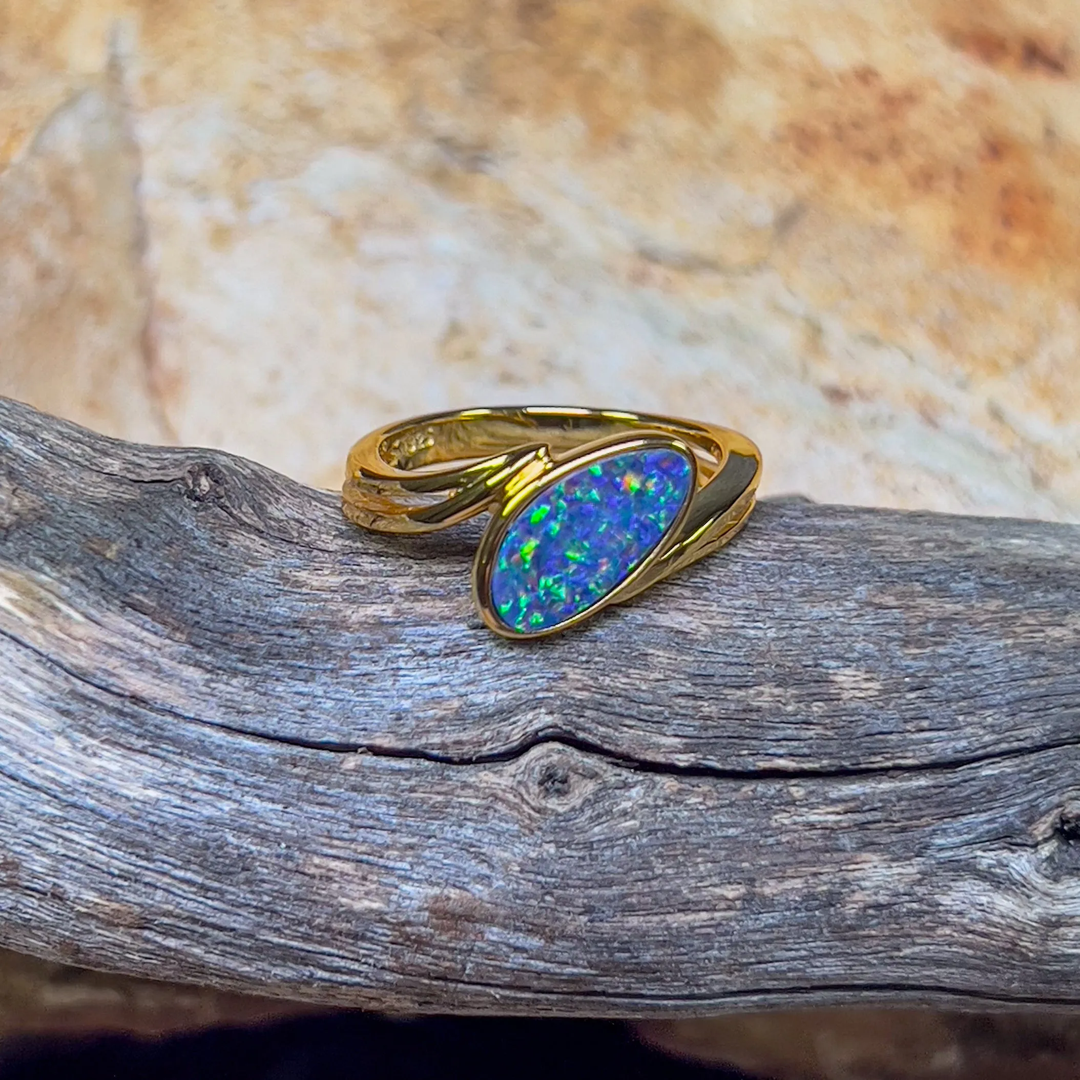 Add an unexpected twist to your jewelry collection with our Gold Plated Sterling Silver Opal doublet ring. This unique piece features a playful crossover style, providing a fun and unconventional touch to any outfit. Upgrade your accessory game with our doublet ring today!