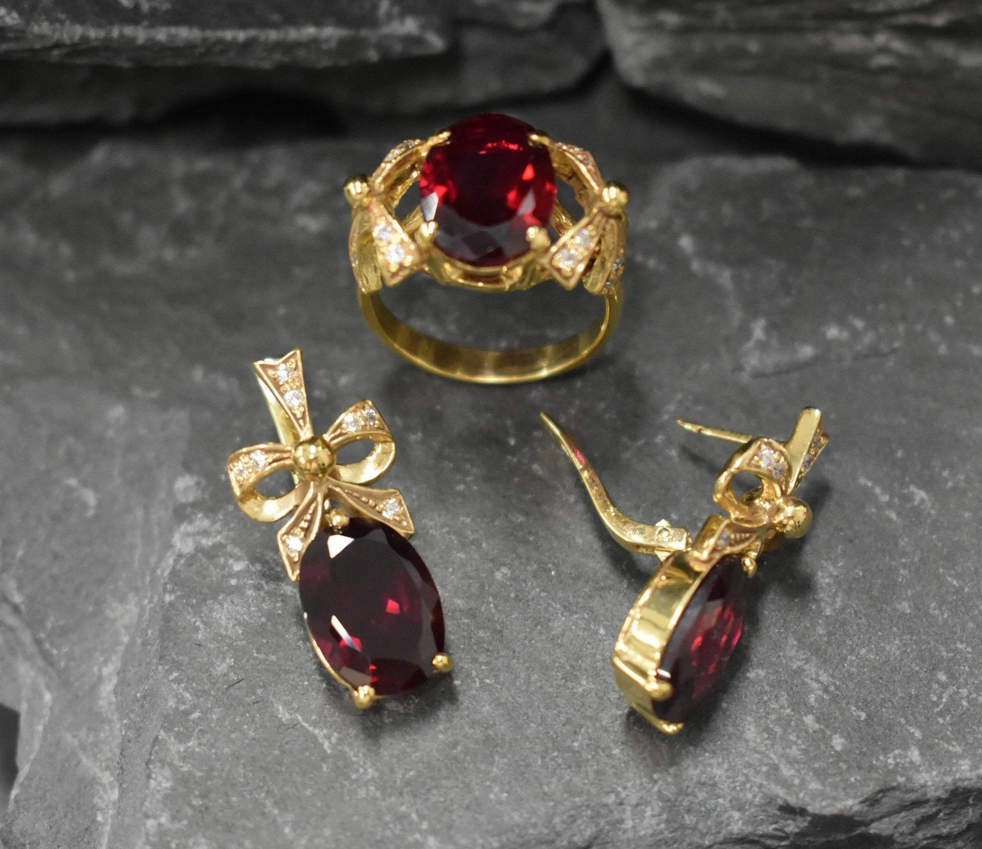 Gold Ruby Earrings set with a Red Large Created Ruby in a perfect diamond cut & flawless clarity - large stone size 14x10mm (16 Cts a pair).