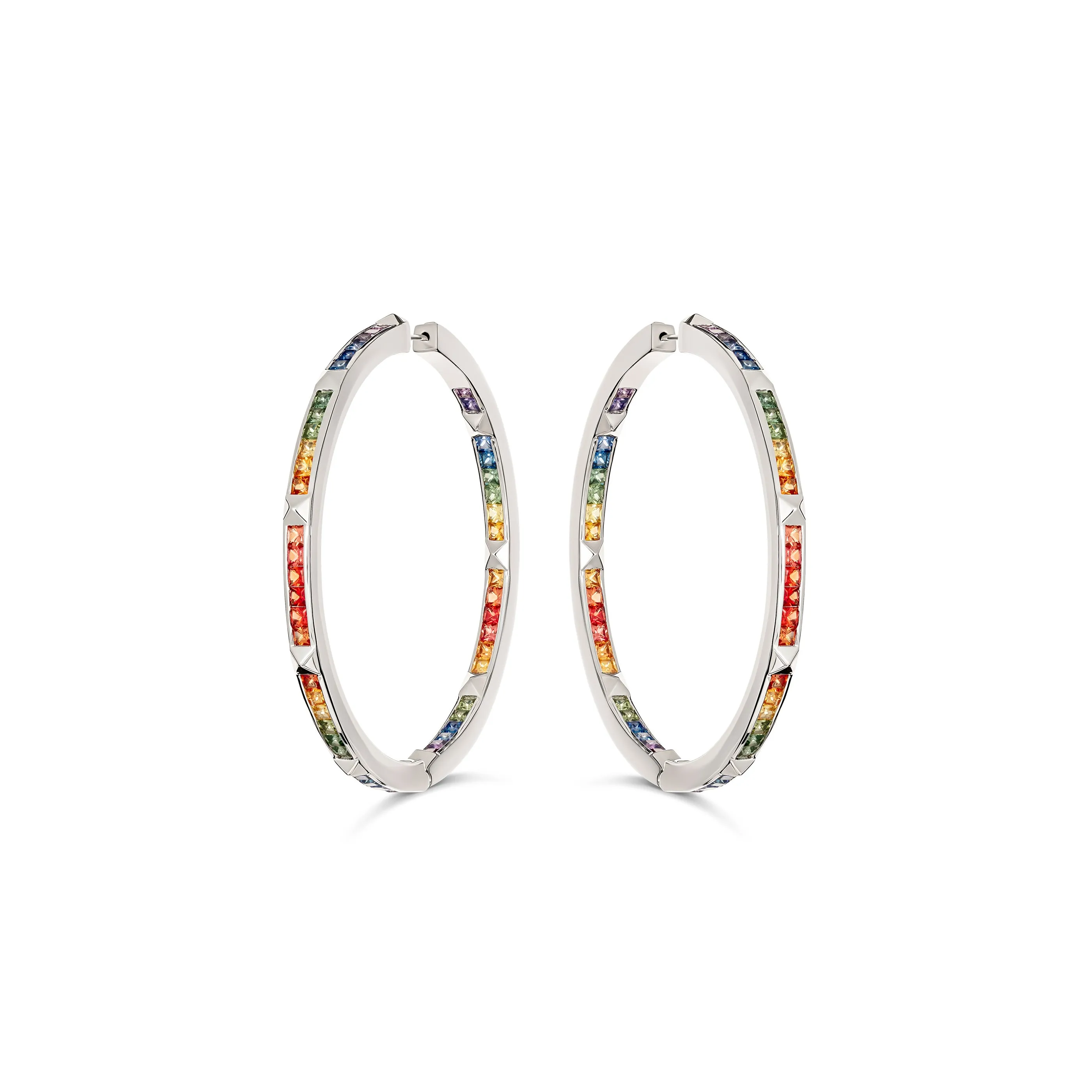 The R.08® Une Full Moon Rainbow Sapphire Hoop Earrings are hand crafted in 18K White Gold, and designed with princess cut multi coloured sapphire gemstones that are separated by the iconic R.08® motifs that cover the eternity of the earring.