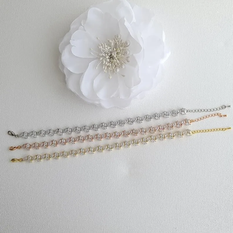 This dainty rose gold tennis bracelet is made of cubic zirconia with rose gold plating. This leaf-shaped tennis bracelet is also available in silver and yellow gold finishes too