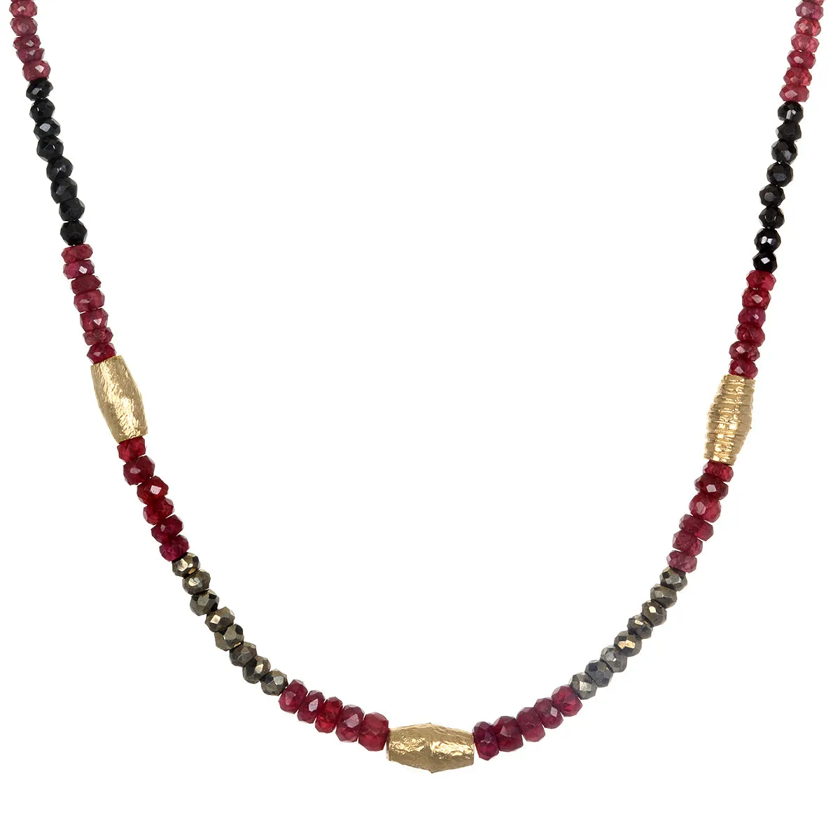This spinel, pyrite, ruby and gold necklace features handmade gold beads. Strands are available in 3 lengths which may be worn layered together or the longer strands can be doubled around the neck.