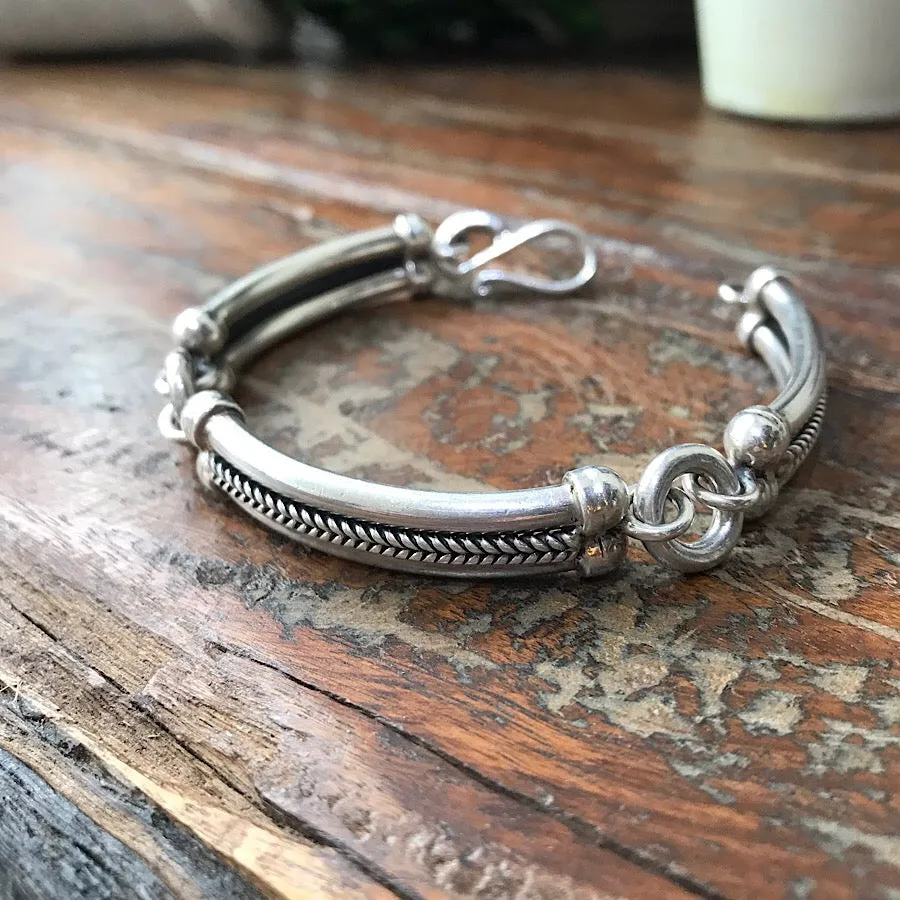 We are all striving to find that delicate balance in our lives. The three links in our simple sterling silver Balance Bracelet represent the three parts of creating life balance: the body, mind, and soul. This hook and loop bangle will become a visible reminder of what is most important in our life journeys.