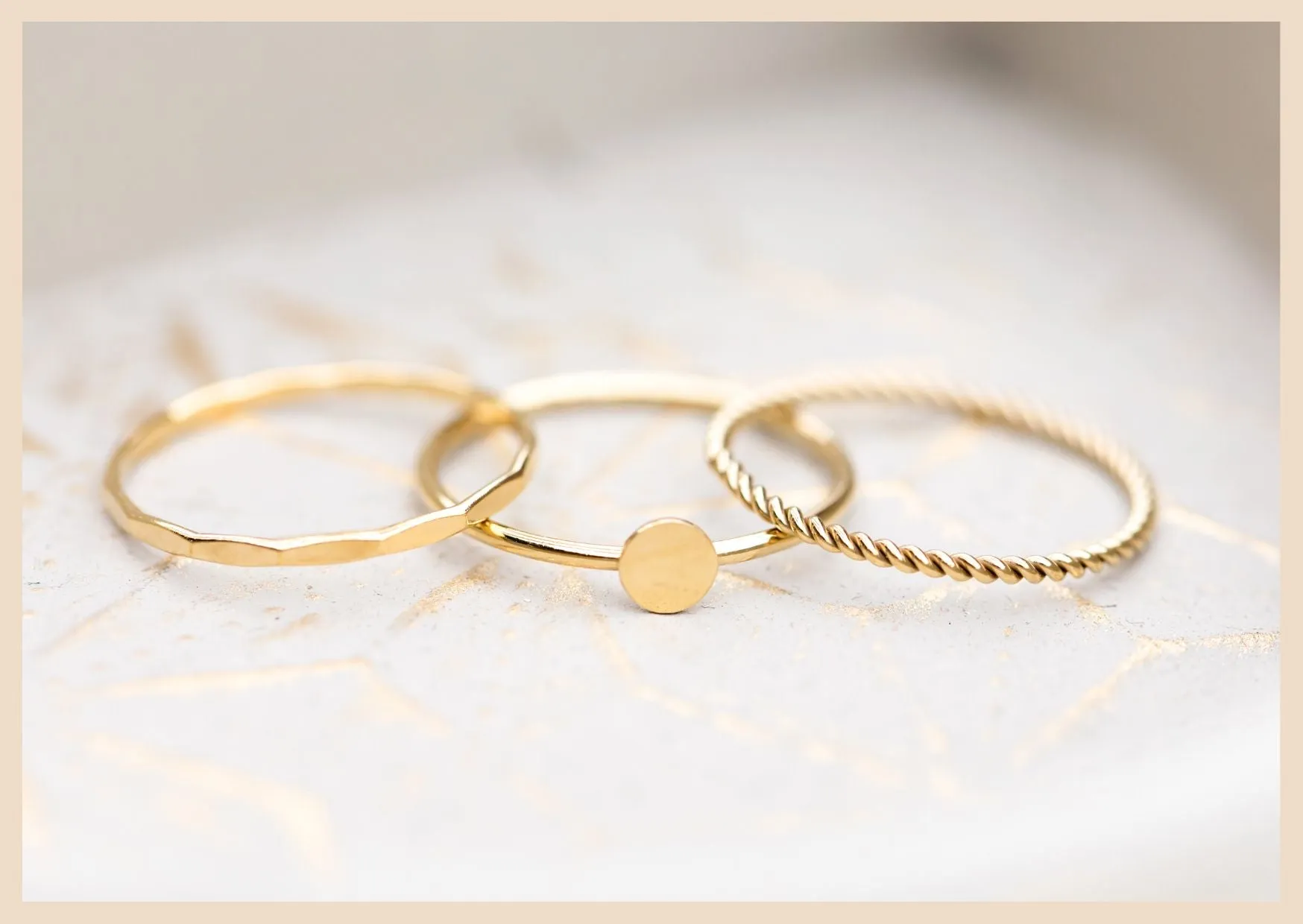 -Includes THREE 14/20K gold filled rings (1 twisted ring, 1 faceted ring, 1 disk ring)